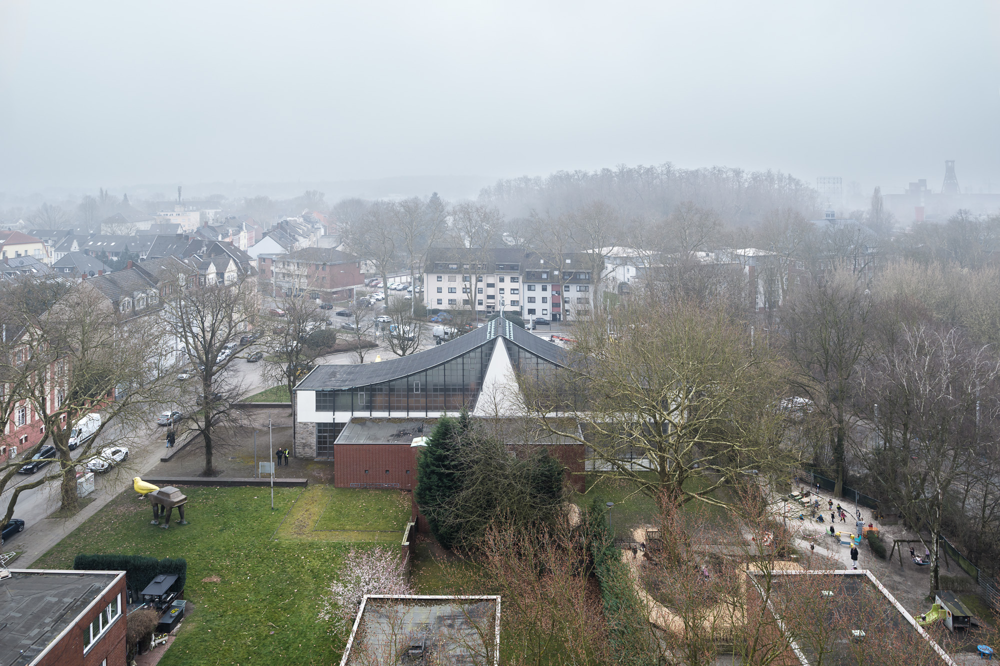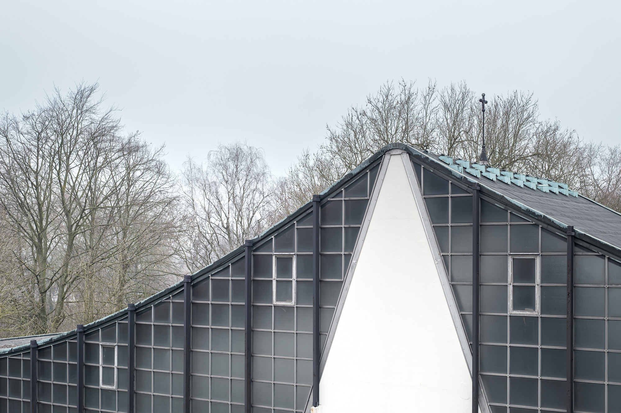 Anders als in den ersten Modellen vorgesehen, hat die Heilig-Geist-Kirche heute nur einen kleinen Glockenturm, der sich über der Sakristei erhebt © Reimond Spekking, CC BY-SA 4.0